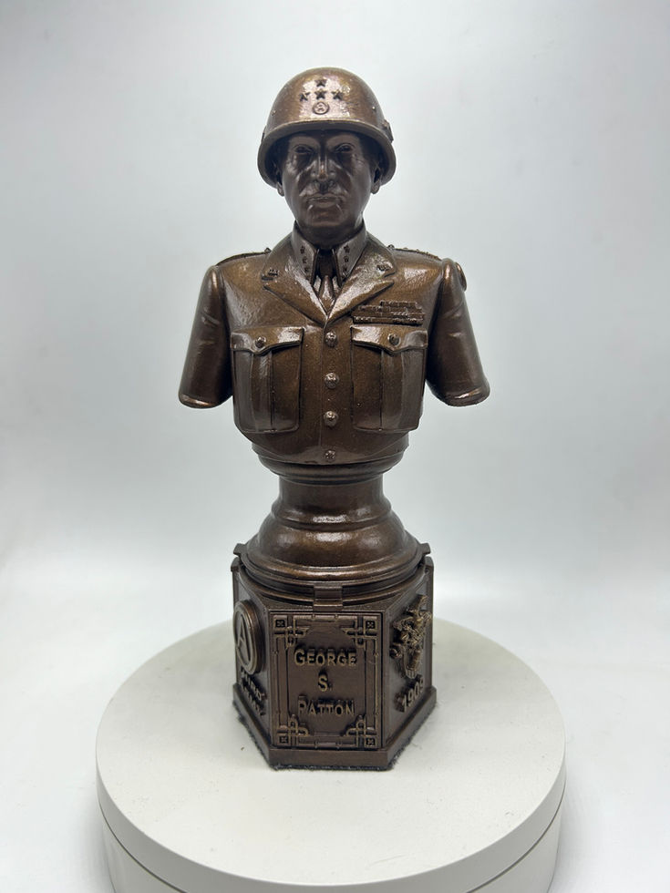This bust is depicting General George S Patton as the artist imagines him looking in 1945 after WWII. Patton was a general in the United States Army who commanded the Seventh Army in the Mediterranean Theater of World War II, and the Third Army in France and Germany after the Allied invasion of Normandy in June 1944. The bust is representing Patton as he appeared in Germany after the Allied defeat of Germany in May, 1945 The figure is 3D printed and painted in metal acrylics by the artist. The details are amazing from the buttons to all the patches he was awarded are a portion of the statue. The base is unique with bas-reliefs of the year he graduated West Point and vaeious ensignia representing different commands he held..