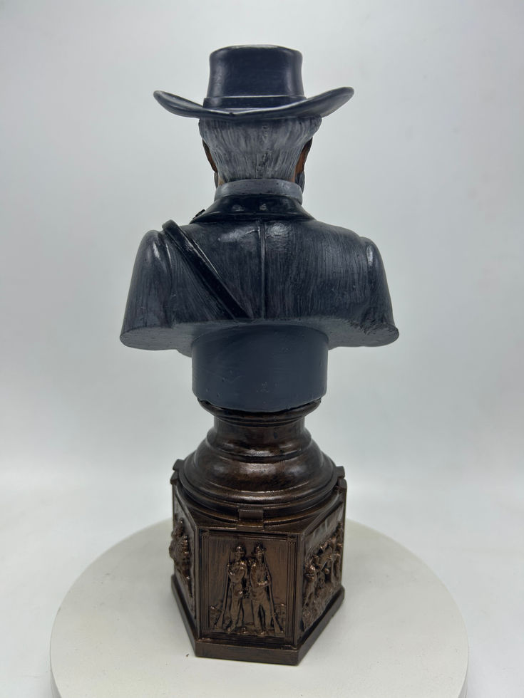 This bust is depicting Robert E Lee as the artist imagines him looking in 1863. The bust is representing General Lee around the Battle of Gettysburg. The figure is 3D printed and painted in acrylics and pastels by the artist. The details are amazing from the buttons to the 3 stars on his collar unique to the bust portion of the statue. The base is unique with bas-relief images from the Civil War.